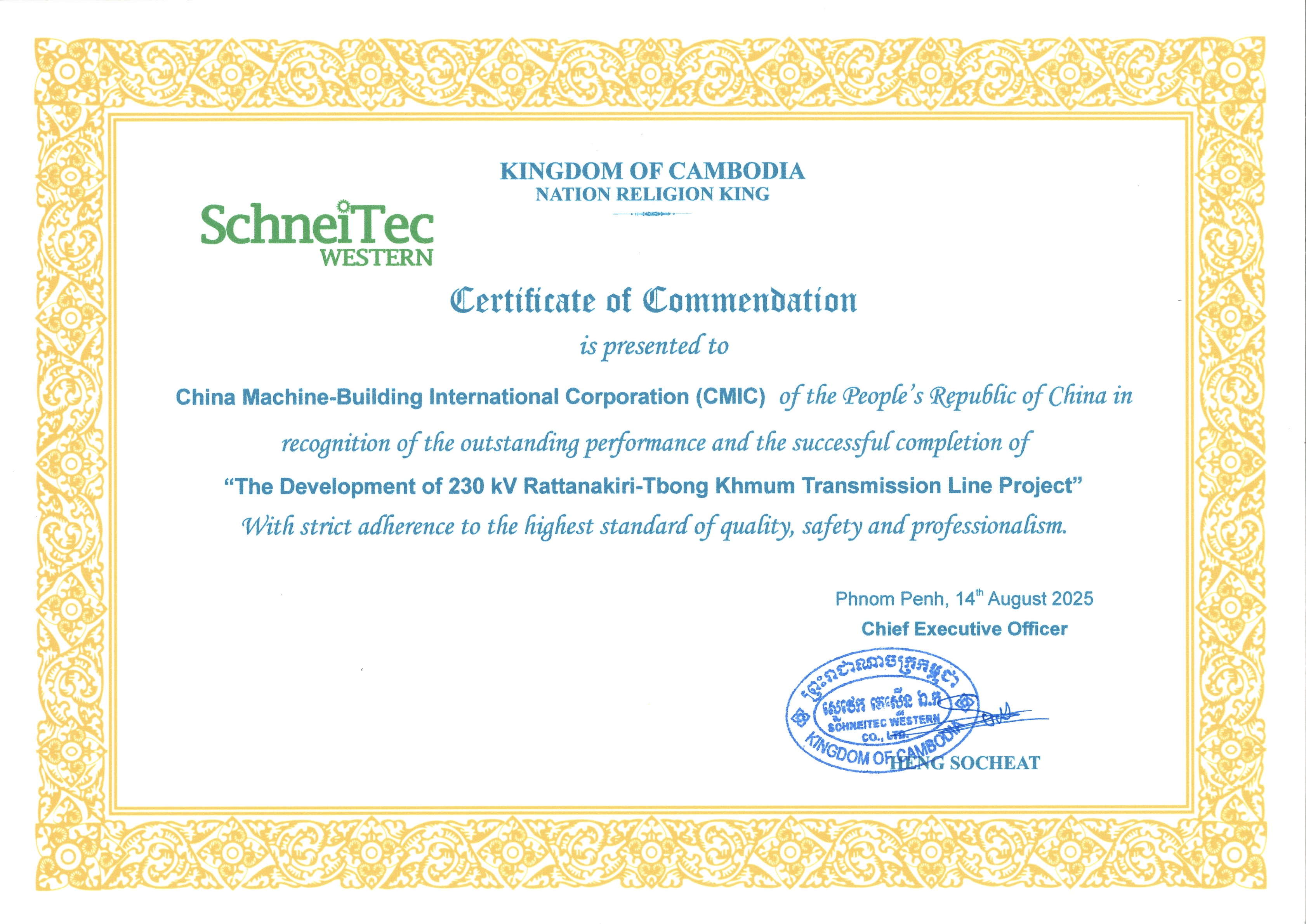 施耐泰克公司對(duì)中機(jī)對(duì)外的專業(yè)能力和卓越貢獻(xiàn)表示感謝。業(yè)主指出,中機(jī)對(duì)外項(xiàng)目團(tuán)隊(duì)不畏復(fù)雜地質(zhì)條件和惡劣氣候,積極協(xié)調(diào)各方力量,始終堅(jiān)持高標(biāo)準(zhǔn)施工和全流程質(zhì)量管控,確保了工程安全、優(yōu)質(zhì)、按期完成,為柬埔寨電力基礎(chǔ)設(shè)施建設(shè)再樹標(biāo)桿,也為雙方今后在更大范圍、更高層次的合作奠定了堅(jiān)實(shí)基礎(chǔ)。